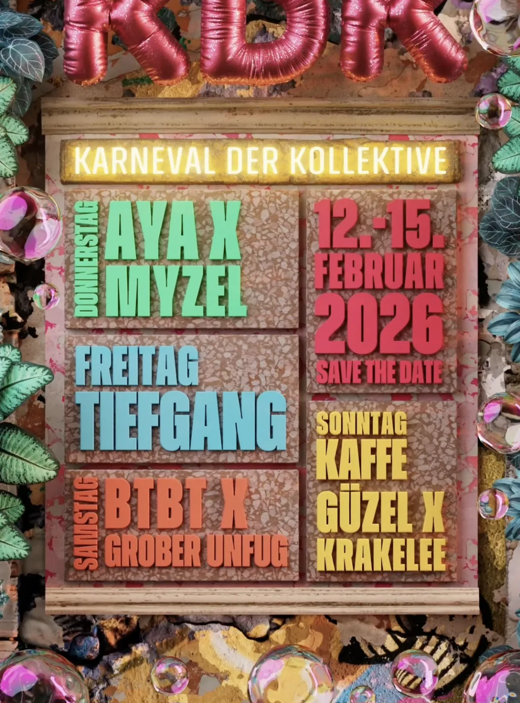 Von Weiberfastnacht bis Karnevalssonntag überlässt uns das Bürgerzentrum Ehrenfeld (BüZe) das Haus – und wir lassen die Jecken rein! Sieben Kölner Partykollektive bespielen die Räume mit Musik, Tanz und guter Laune. Am Karnevalssonntag übernehmen krakelee und Kaffee Grüzel das Ruder: Oben erwartet euch feinster House, unten gibt’s Techno mit der unverwechselbaren krakelee-Handschrift.