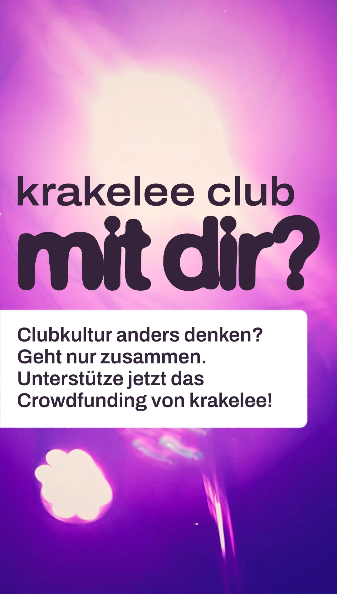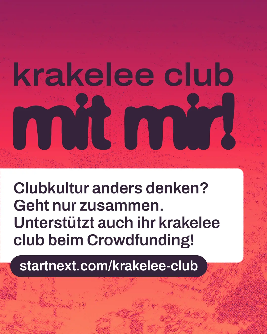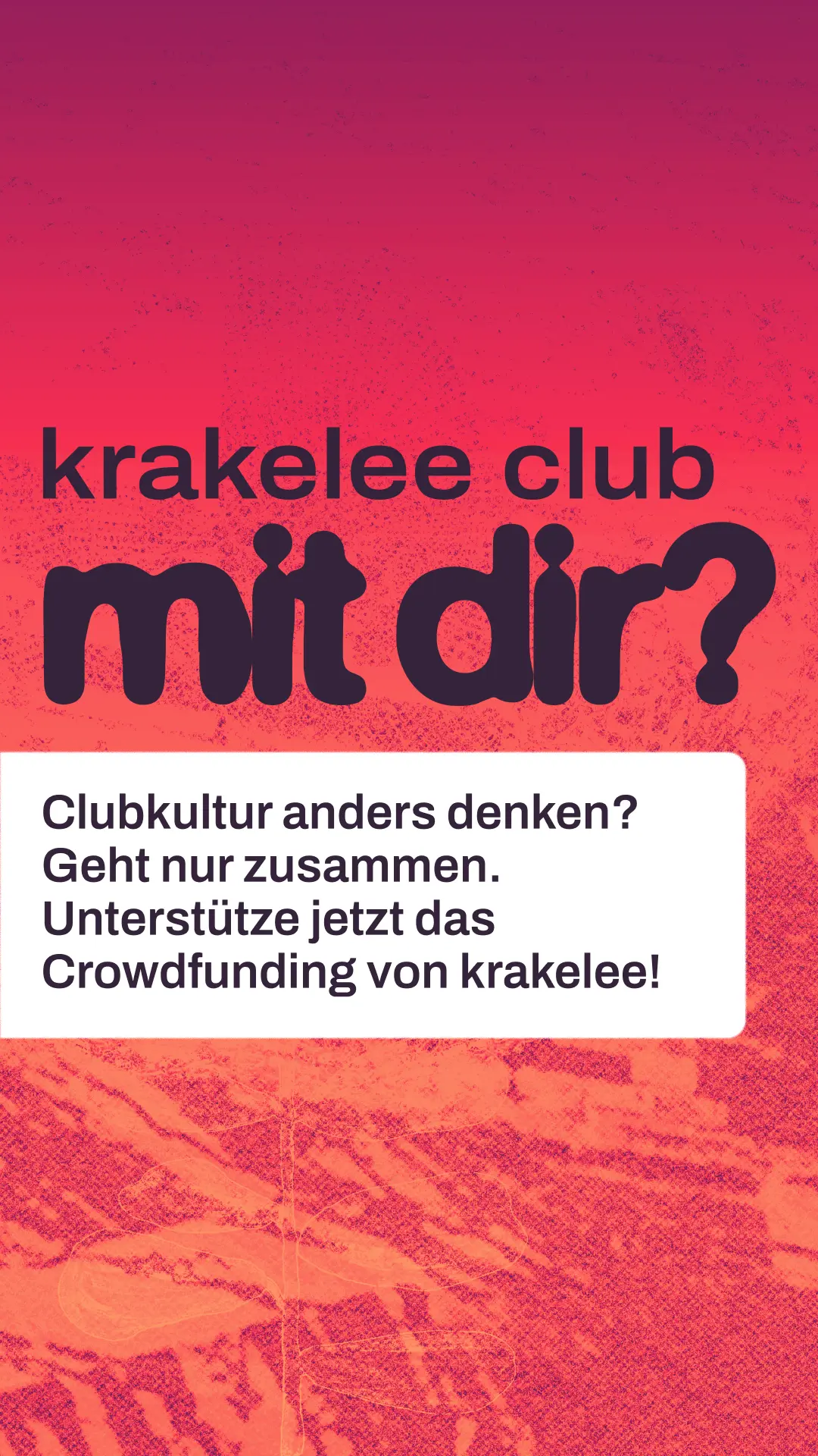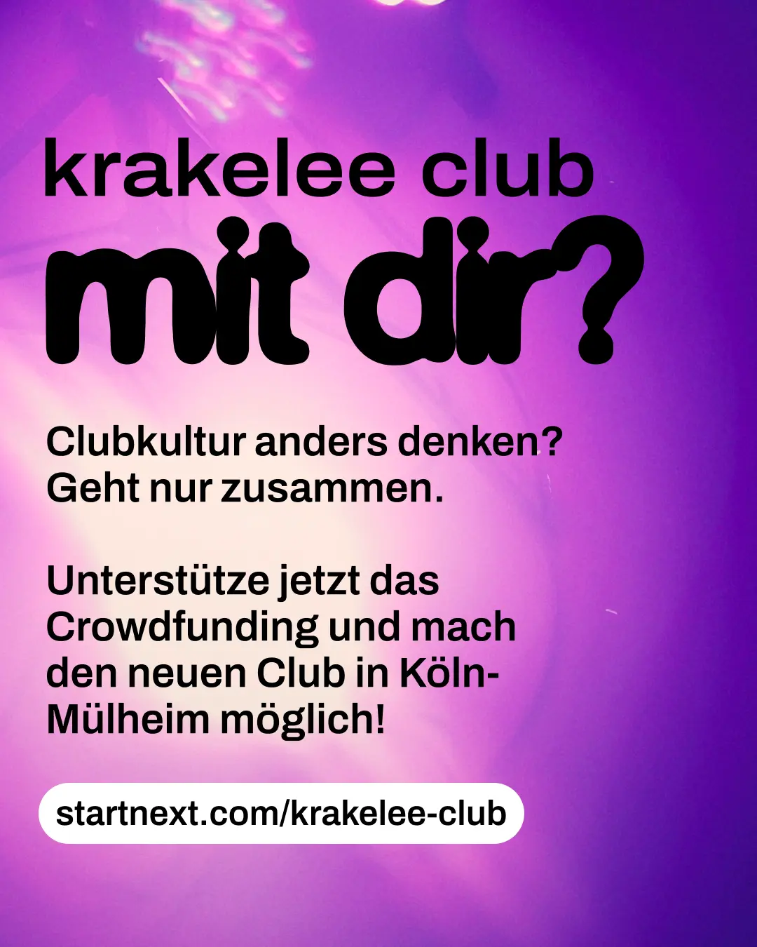 Hi! Kennst du schon krakelee? krakelee ist ein kollektiv organisiertes Projekt, das einen genossenschaftlichen Club in Köln aufbauen will. Ein Ort, der nicht von Profitlogik lebt, sondern von Community, Solidarität und Kultur. Aktuell läuft ihre Crowdfunding-Kampagne, um die nächsten großen Schritte auf dem Weg zum Club möglich zu machen. Wenn du Nachtleben liebst und an gemeinschaftliche Kultur glaubst: