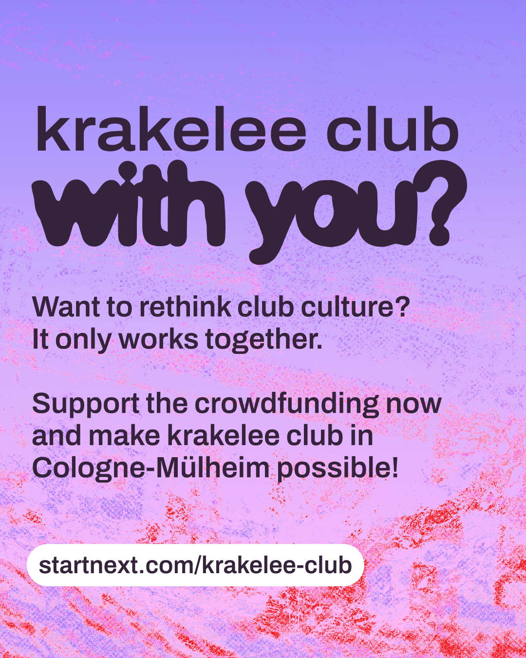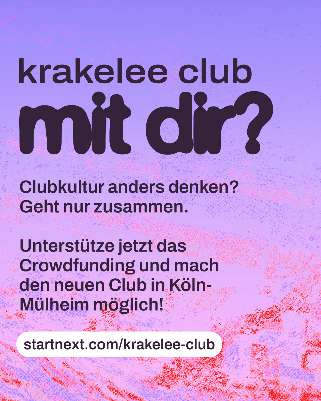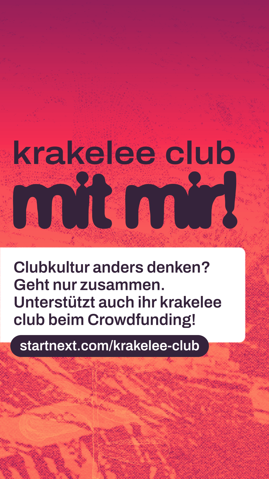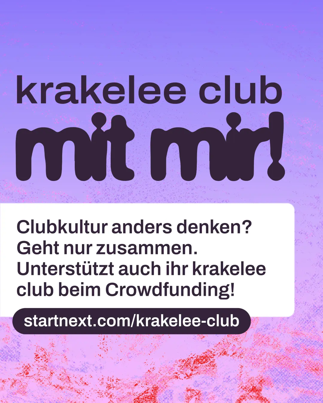 Hi! Kennst du schon krakelee? krakelee ist ein kollektiv organisiertes Projekt, das einen genossenschaftlichen Club in Köln aufbauen will. Ein Ort, der nicht von Profitlogik lebt, sondern von Community, Solidarität und Kultur. Aktuell läuft ihre Crowdfunding-Kampagne, um die nächsten großen Schritte auf dem Weg zum Club möglich zu machen. Wenn du Nachtleben liebst und an gemeinschaftliche Kultur glaubst: